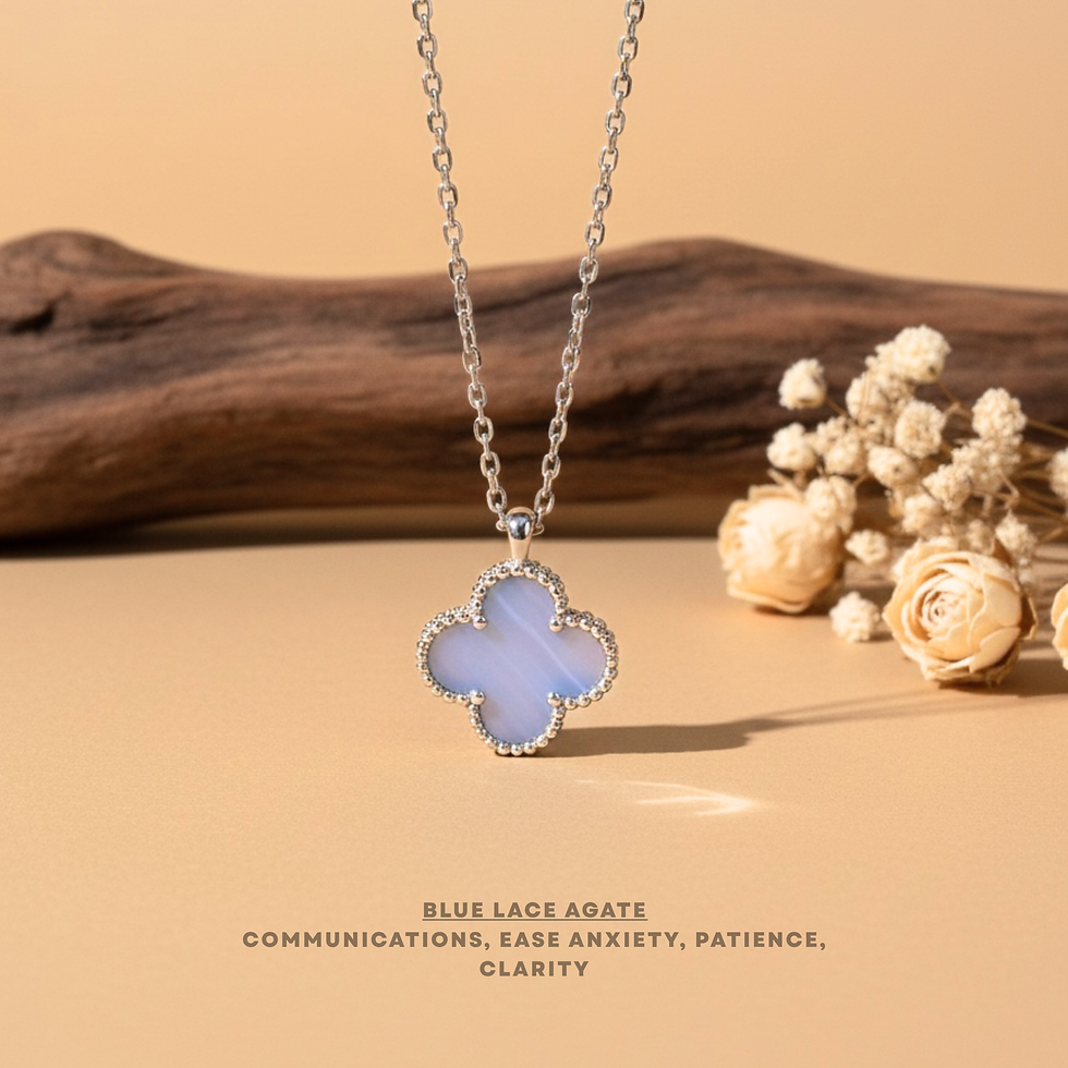 DIVA- Blue Lace Agate Silver Clover Necklace